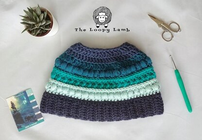 The Polar Puff Messy Bun Hat is made with Caron X Pantone Yarn. Created to have a lot of texture, this hat is good for adventurous beginners that want to try a few different techniques in one small project. If you're using the X Pantone yarn, I use the darkest colour for the band and then work the colours after the band lightest to darkest.