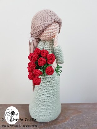 This written crochet pattern includes all the instructions needed to make your very own lady holding roses. ‘The Proposal VERONICA’ has got to be the most beautiful blushing bride to be. ever. With her one dozen long stemmed red roses, she is ready to say YES !!!