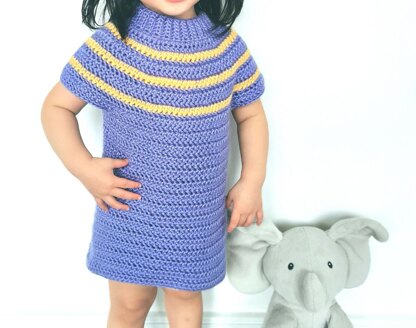This simple beginner-friendly sweater dress for kids has a top-down yoke design. Once the collar ribbing is complete, we will begin expanding the yoke by crocheting in the round while increasing at the same time and adding a few rounds of colour stripes using a second colour of your choice. To make a clean edge, add one more round of sc to the bottom and sleeves to give it a finished look. No seaming is required for this pattern.