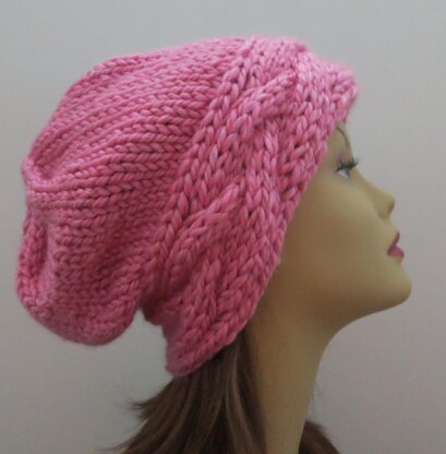 The Roxy Hat is a wonderfully big, warm and cuddly soft hat. Design elements include a hint of a braid in the brim and a star pattern on the top. This is a quick and easy knit using super bulky yarn.