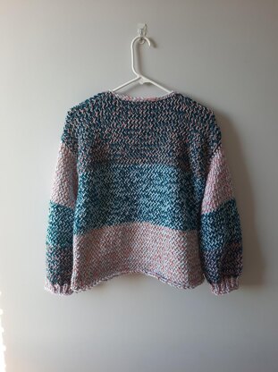 -Cozy box sweater with a slightly cropped sleeve -Uses two strands of dk/medium yarn at once to create fun, multi-dimensional color -Available in 5 sizes (Adult XS-XL). Scroll to the last picture to see the dimensions of each size