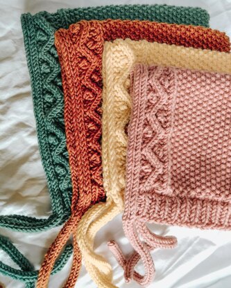 This sweet bonnet is constructed by knitting one long rectangle, sewing the back closed, and then picking up stitches along the bottom and front to finish the edges. The body of the bonnet is worked in moss stitch with a simple cable twist with bobbles. The bottom edge has a 1x1 rib, and the front edge, along with the ties, are worked in i-cord.