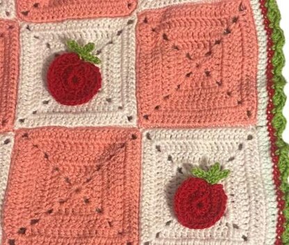 This handmade crochet blanket features a delightful patchwork of square motifs in soft pinks and whites, each joined in a neat grid. Some squares are adorned with vibrant red strawberry appliqués topped with green leaves, adding a playful, fruity touch. The blanket is finished with a scalloped border in red and green, giving it a sweet, whimsical charm perfect for cozying up or displaying as a cheerful accent piece.