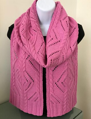 The Sunderland design, with its cables and lace, makes a bold, somewhat geometrical statement while still being feminine. The scarf has 4-stitch cables separated by slipped stitching and lacy diamonds in between. This design can also be used to create a wrap or shawl with alternating slipped stitch cabled columns; however, a separate Sunderland Wrap/Shawl pattern is in the works.