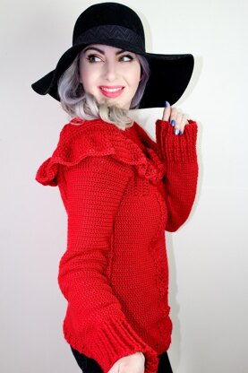 The Thistleberry Sweater is perfect for the Holidays! A festive ruffle hugs the shoulders of this pullover, while two intricate cables run down the front panel.