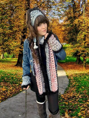and what’s even better is that you can make the scarf and the earwarmer and wristlets set using around 450YRDS of two strands of a WORSTED WEIGHT YARN or alternatively 450YRDS of a bulky/cat 5 yarn.