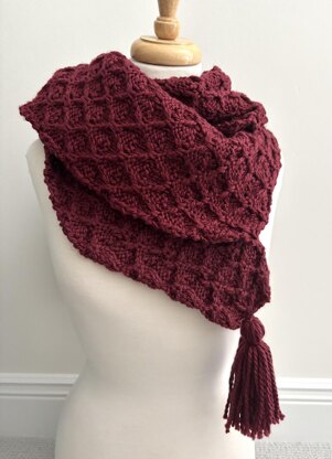 This hooded scarf is very versatile and can be worn in many different ways. You can wear the hood up in the cold winter months, or down with the scarf loosely wrapped in the fall and spring. This is knit in a fun and addictive stitch pattern that will keep you from getting bored. I had a hard time putting this one down. It is knit in my favorite bulky yarn weight with a US #10.5 needle. Finished measurement: 9" x 80" plus tassel length