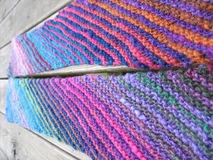Named as a tribute to my neon 1980s Lisa Frank Trapper Keepers, this scarf is a nice way to use up two skeins of Noro Kureyon or any other self-striping yarn (suggestions for alternate yarns in the pattern notes.) It's a very easy pattern--garter stitch, knit on the bias.