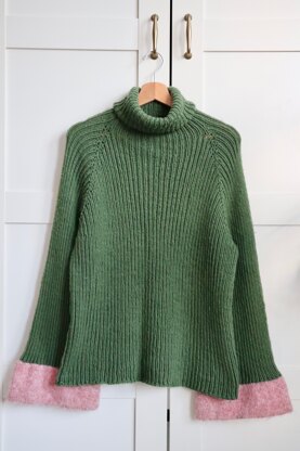 The Wizard Jumper is a seamless knit, worked from the top down in Fisherman’s Rib. First, the roll neck is created, before working raglan increases for the yoke. The stitches are then divided for the sleeves and new stitches are cast on at the underarm. The body is worked separately while the sleeve stitches rest. The sleeve stitches are then picked up and worked with increases to create the flared sleeve. A contrasting colour yarn is then added in stocking stitch to finish. The Wizard Jumper is designed to be oversized.
