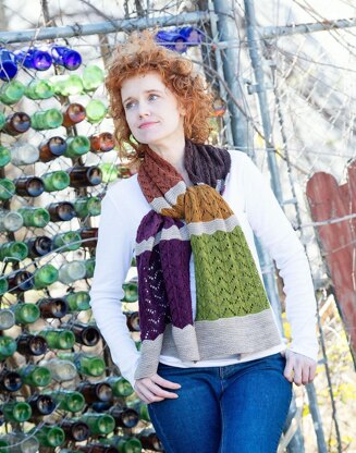 Think it Through is designed to show off a six-color gradient set, with simple garter ridges separating colors. Every other row of the 10-stitch, 8-row lace repeat is a rest row, and after several repeats the lace pattern becomes intuitive, making this a great project to pick up when your mind is a bit distracted.