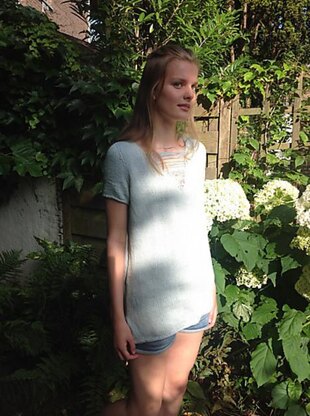 *This airy tee has a fabulous thread-covered neckline, created by dropping stitches, held in place by clever decreases. You will have a deep V-neck and yet there's coverage.