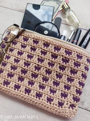 How to crochet a fun bag that uses a mosaic crochet technique, & is perfect to use as a cosmetic bag, crochet hook/notions bag or for travel size toiletries. Video tutorial included. The idea of mosaic crochet may intimidate you, but please don't let it. This stitch pattern is comprised of single crochets & chains with some double crochets to create the overlap. I think a confident beginner could do this. While my favorite way to work this technique is with a variegated color underneath, & a solid coordinating color on top, it also looks great with both solid colors, or even all in one. You'll need 150 Yards of Worsted Weight Yarn (I used WeCrochet Dishie Yarn in Linen (95 Yards) & Mulberry (55 Yards), H8/5mm crochet hook, tapestry needle & if you want to line it, either fabric & zipper or a canvas bag of the same size (I get mine at Hobby Lobby), & needle & thread. I recommend cotton yarn because it's more durable, and this bag will most likely see a lot of wear.