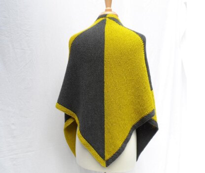 A triangular garter stitch shawl in two colors. Pick colors that have some contrast! This shawl is knit modularly by picking up stitches along the edge of previously knit triangles. The border is picked up and knitted in sections.