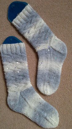 Thunderstruck sock has been designed as a quick knit - using double knit or sport weight yarn. The easy pattern design on the leg uses only knit and purl stitch, and has an 8 stitch pattern repeat. The stitch pattern gives a lovely textured design to the leg fabric of the sock - reminiscent of a zig-zag or double parallelogram effect. Suggested gauge is 7 stitches per 2.5 cm measured over Stocking Stitch using 4mm needles or 6 stitches per 2.5 cm using 3.75 mm needles. Please note, however, the gauge is a suggestion only. Some knitters knit tightly and some knit loosely - so you may need to go up or down a needle size according to the yarn type or individual knitting style. I like a 'tailored' fit to my socks so I have used 3.75mm needles. I have used 100g of King Cole Galaxy DK, which comes in a range of gorgeous colours, with small sequins spun into the thread for a sparkly effect. Foot length is adjustable.