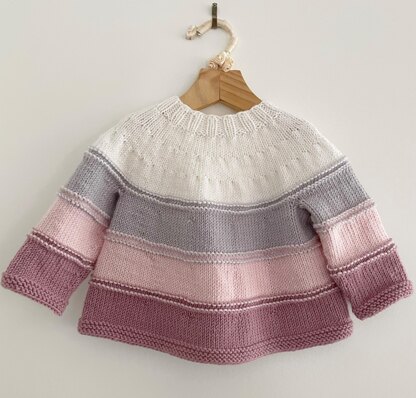 Tiffany is a cute little loose-fitting, top-down yoked baby sweater (jumper/pullover) that combines wide stripes of colour with bands of texture. The pattern is great for using up small amounts of leftover fingering or light sport weight yarn in 4 colours.