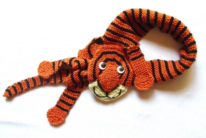 A quick and simple fun scarf to knit. Like his mate the lion, this little tiger is made so he can hold his tail in his mouth – handy for keeping in place around your neck.