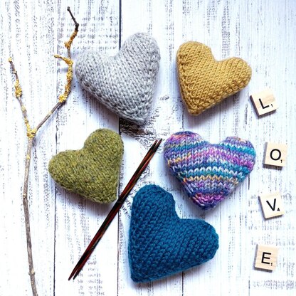 The 3D heart shape is knitted flat, in one piece. It’s a quick knit with very little sewing up. Double-pointed needles are essential as you will be turning the work. This pattern has been written for double knit (dk) yarn but can easily be adapted for most yarns by using needles a few sizes smaller than stated on the yarn band. The aim is for the fabric to have quite a close weave, so the stuffing doesn’t show. The dk hearts measure approx. 7 to 8cm wide, depending on yarn and tension. A good way of using up scrap yarn.