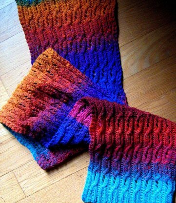 written directions - advanced beginner level The cables display a slight list, first right and then left. There is a touch of lacy open space in the center of the cables. The yarnovers that give it a slightly off kilter bent, also serve to lighten the piece.