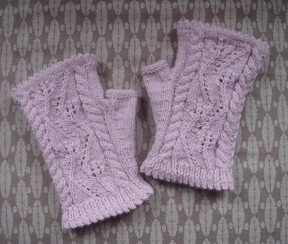 Fingerless mitts/gloves with a lacy Tilting Leaf pattern in the centre and panels of narrow cables on each side of the Leaf panel. The same pattern is on the palms of the gloves. The thumb gusset is in plain stocking stitch. There are picot edgings at both top and bottom of the gloves and a narrow rib at the cuff.