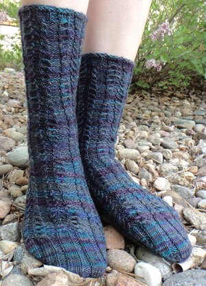 This stitch pattern has very little ease. You may need to go up a sock size or needle size to get proper fit. More information about these adjustments are detailed in the pattern.