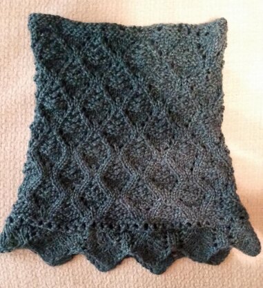 This cowl is one-size fits all, features a fun zigzag bottom, and an elegant lace pattern. The cowl is smaller around the top to lay closer to the neck for warmth. The lacy pattern is very forgiving of gauge, and most any worsted weight yarn will work. Lion brand Heartland yarn has enough yardage to only use one skein for this cowl!