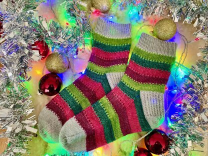 For me, there is nothing better than a pair of socks knitted using pretty mini skeins of yarn. Combine this yarny joy with a festive theme, and I'm in knitting heaven!