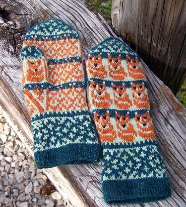 With this pattern, you can knit mittens for the whole family! The PDF has charts in three sizes - for adults (64-st wide, in two different color options), kids (sized like my other kids mittens, should fit 5-6 yo if knitted with fingering-weight yarn), and two tiny baby-sized thumbless mittens. A few black stitches on foxes' noses and eyes are embroidered with duplicate stitch. The pattern is in pictorial form with very clear, full-color charts for both hands and thumbs; there is no written instructions.