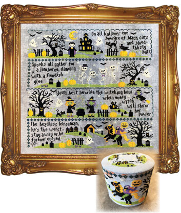 Welcome to our 2019 Halloween Stitch-A-Long! This 4-Part Series features cute & spooky vampires, witches, ghosts, skeletons, bats, cats, and a fun Halloween rhyme on every section. This design can be stitched together as one large Spooky Sampler, but if you prefer to try a different finish, each section of this design can also be stitched and finished into a Stackable Drum. There are 4 bonus circle designs (to use as the top of the drums) included with each of the 4 section releases, along with finishing instructions to make up the drums. See the sneak peek photo! This chart uses 9 DMC colors (1 skein unless otherwise stated): 712 (2 skeins), 3326, 742, 721, 471 (2 skeins), 470 (2 skeins), 3808, 550, and 310 (5 skeins).
