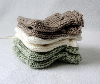 Adorable little sock-style booties for baby girls and boys. Seamless styled toes and heels using detailed short row instructions. Quick and easy little accessory to coordinate with unisex outfits. A fun and useful way to use up small bits of stashed yarn. Ties may be contrast or monochromatic in ribbon, crochet chain or knitted I-cord. There is an option for a crochet picot finish edge, or a knitted finish.