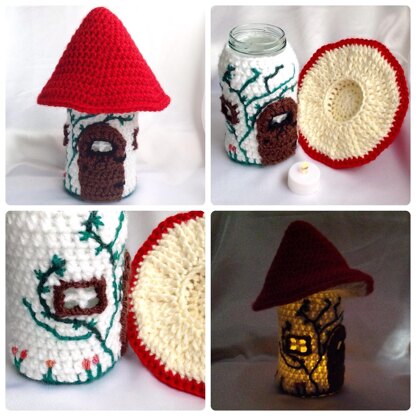 This sweet little Toadstool Fairy House Jar Light has been designed using a 500g pasta sauce jar measuring 25cm around the widest circumference and 14.5cm in height up to the lid. Most glass jars have the same neck size of 21cm around the circumference with the lid on, this pattern can be adjusted to any jar with this neck measurement and instructions will be given to do so.I have used a LED tea light candle style light, you can use any battery powered LED lights inside for the jar light. Not for use with real flame candles, keep to LED lights to ensure it does not overheat.