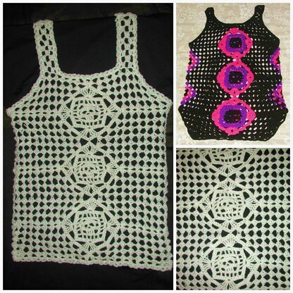 Directions include how to Make either the tank or the tunic to fit Small Adults to Plus size. Add as many rows as you need to make up the width you desire. Add or subtract Toltec skull motifs to change the length. Pictures of many of the rows. American Crochet terms.