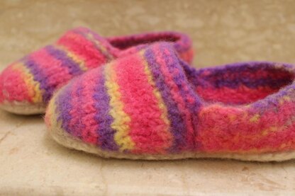 The slippers can be made with either a single sole or a double sole, for a warmer shoe. The nice thing about the double sole is choosing the three colours - the colour of the inner sole runs like a line between top and sole on the outside of the shoe.