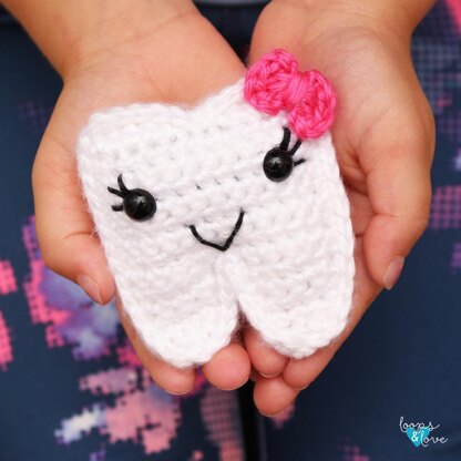 These Tooth Fairy Pouches are great for kids that are starting to lose teeth and need a safe place to keep them until the Tooth Fairy visits! When finished, these Tooth Fairy Pouch measure about 2.5”x 3.” This crochet pattern is worked up in two tooth shaped panels which are stuffed and crocheted together. Then the pocket will be sewn on the back and the bow, hair, and smile are added at the end.