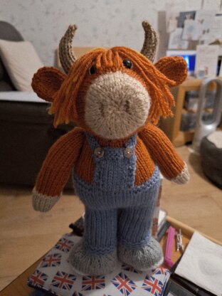 This is a knitting pattern for a stuffed toy highland cow called Torran. The toy is knitted on 2 needles and then sewn.