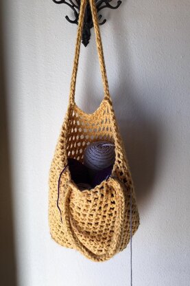 For added strength, it is knit using 3 strands of yarn as one. The purple bag in the picture was knit using Red Heart Super Saver yarn: 1 strand of Orchid, 1 strand of Lavender, and 1 strand of Monet. The bag requires approximately 225 yards of each color.