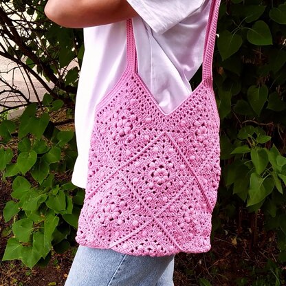 For a bag sizes 12.6"/32cm x 13.4"/36cm, you will need 13 squares and 2 triangles (approx. 5.3 oz (150g)/524 yd (480m), 3 skeins).