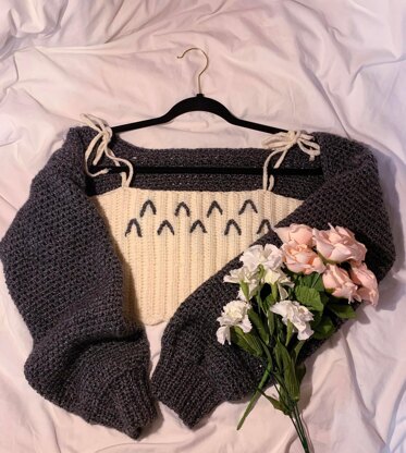 his is the perfect crochet set for summer and autumn days with a cropped cardigan with balloon sleeves, and a scoop neck top. Perfect for low-key cosplay, costume parties, or just a casual cozy outfit.