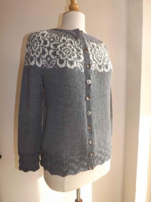 This is a cardigan knitted back and forth from the bottom edge and up with a round yoke and curved edges at the bottom of the body and sleeves. The yoke has a very nice 2 colored pattern worked in stranded knitting with a traditional Scandinavian flower pattern. The pattern is made for at yarn with a gauge of 25 stitches per 10 centimeters.
