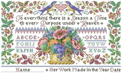 By Sandy Orton. Find delight in nature's gifts throughout the year with this traditional nature sampler. Beautiful birds, foliage and and a bouquet of flowers frame the words: "To every thing there is a season, and a time to every purpose under the heaven." Celebrate the turning of the seasons or a memory of a special day. Or simply personalize with a message unique to you. An instant heirloom.