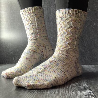 I’ve spent a lot of time hikingl ately. With my adventuring options severely limited by the pandemic, getting into nature and exploring winding trails through woods and meadows has been a balm for my soul. The cabling pattern on these socks mimics those winding hikes – and the pattern looks great in a solid or a wildflower speckled yarn. Have fun exploring!