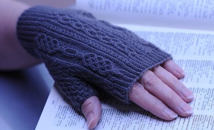 The pattern panels on the backs of the hands are typical of panels found on traditional stockings. The thumb gusset comes out of the palm rather than the side of the mitts, to prevent the pattern from skewing. The stitch pattern on the palm and thumb gusset is one often used as a filler stitch for calf gussets, and is also incorporated into more complex stitch patterns, much like seed stitch and moss stitch are used in Aran patterns.