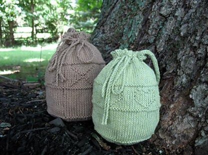 The short icord handle and useful twisted cord drawstring make this little but roomy pouch functional. Picot edging and heart or Xs and Ox motif add whimsy and charm and interest while knitting.