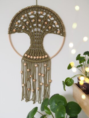 Make your own Tree of Life Wall Hanging. Choose your favourite yarn to make a tree that suits one of the hoops (25, 20 or 15 cm). In this pattern tension is important, because the tree should fit to the indicated hoop diameter. This pattern is made and described with macramé yarn from Durable, which suits a 25 cm hoop. You can also use cotton yarn, you could possibly take several threads together to get a good tension. All informations and the a table for the yarns used, tension and the hoop diameter can be found in the pattern.