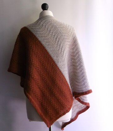 This triangle shawl is worked in two stitch patterns. Firstly a feather and fan pattern worked in one direction. Then stitches are picked up along one side to work the second eyelet pattern in another direction.