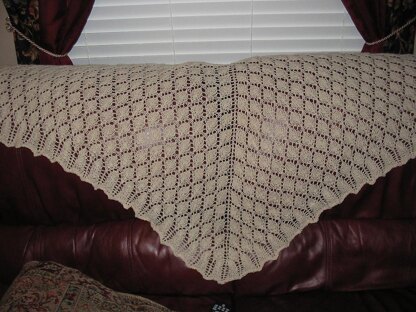 This is a great first time lace project. It can be made in lace weight (1200 yards) using a size 6 (4.00 mm) needle, fingering weight (1000 yards) using a size 8 (5.00 mm) needle or a sport weight (850 yards) using a size 9 (5.50 mm) needle. If you have never knit lace, try making it in your favorite sock yarn. It has an simple repeat that is easy to learn. Enjoy!