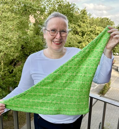 I still had a ball of yarn left over from my spring-fresh loop. So, I made a small triangular shawl with the cheerful pattern of the Portuguese pavement in Ponta Delgada, the capital of the Azores. The silk content makes it very soft and drapes beautifully around the neck. Have fun knitting it!