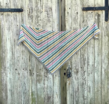 Crochet pattern for a colourful triangular shawl.