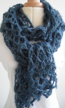 A cosy crochet scarf that is just wide enough to be worn as a stole. It is designed especially for Rowan Kidsilk Haze Trio, a lovely aran weight mohair yarn made of three different coloured threads twisted together. As made to the pattern the scarf measures 37cm wide by 180cm long when blocked.