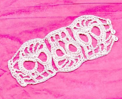 Day of the Dead crochet bracelet pattern. I used a size 3 hook. There are photos of each step. Made up in embroidery floss it is slightly larger than made in crochet cotton. uses a small amount of crochet cotton, or 4 skeins of embroidery cotton