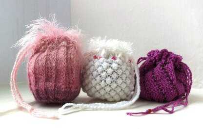 This pattern comprises three separate designs in one, for double-drawstring keepsake bags. Featuring beading and fluffy yarn to finish.